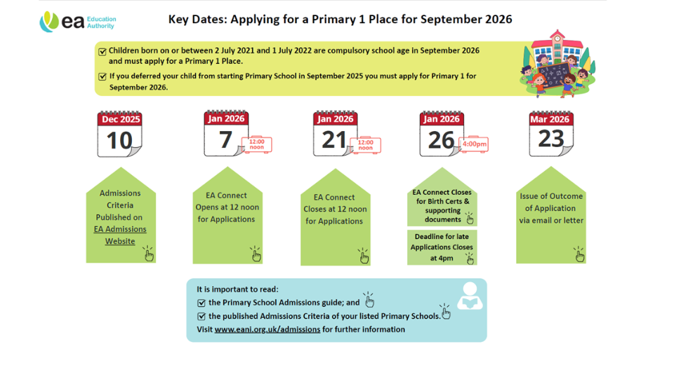Children born on or between 1 April 2021 and 1 July 2021 (inclusive) and children born before 1 April 2021 but with a due date on or after 1 April 2021 whose parents deferred their admission to primary school in September 2025 must also now apply for a place in a Primary School for September 2026.
